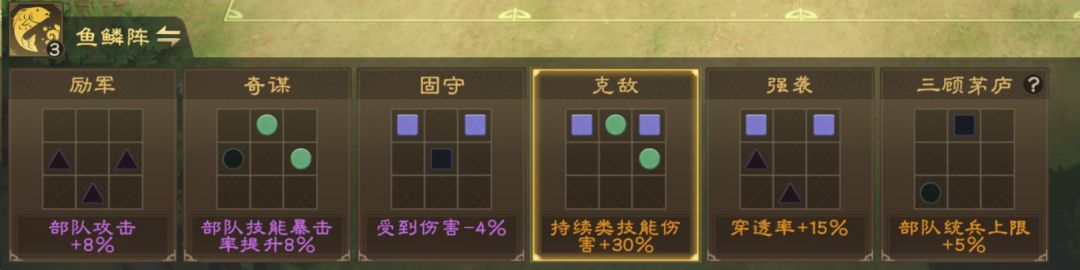 鱼鳞阵能同时提供部队异常伤害和武将怒气加成,均为部队核心增益需求,布阵增益带来的持续类技能伤害和生存加成也是异常盾所需要的。