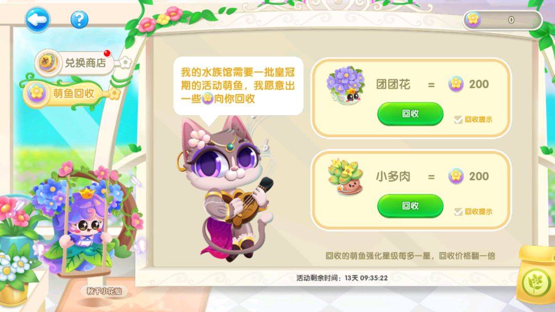 花房小铺将新增萌鱼回收处,将皇冠期团团花和小多肉进行回收就能获得娜娜的回馈道具“种子积分”,使用种子积分可到商店兑换好礼~