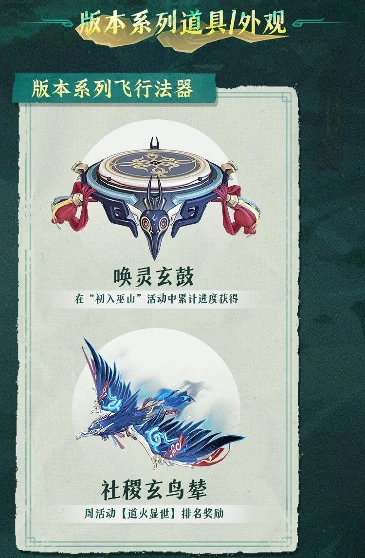 飞行法器·仙巫融合▸唤灵玄鼓:踏鼓御空,音波破云 ▸社稷玄鸟辇:玄鸟拉辇,羽翼燃火特效
