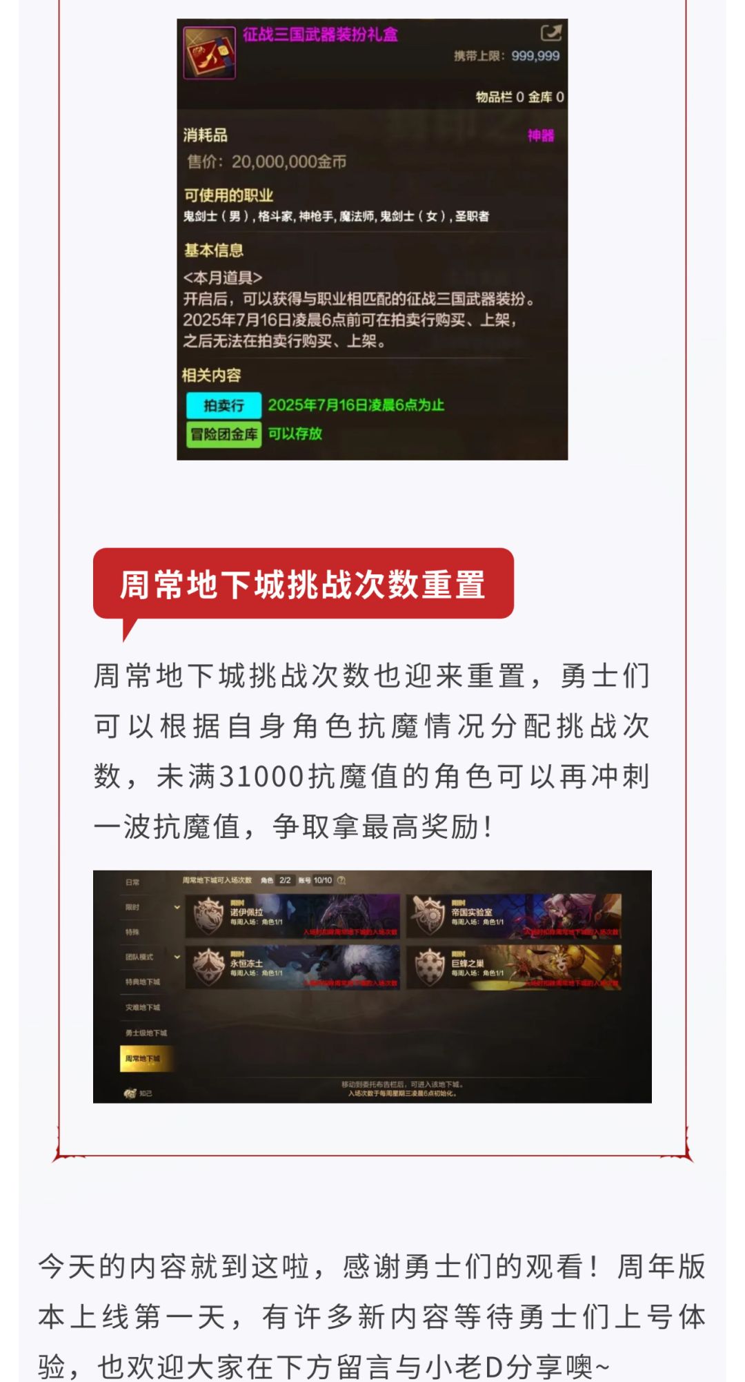 今天,周年版本已正式上线,勇士们有没有领取到永久特别款全套天空呢?为了助力勇士们迅速掌握周年版本内容,不错过任何奖励,小老D整理了由热心勇士们分享的周年版本首日流程攻略,大家可以根据自身情况进行参考。快来一同瞧瞧吧!