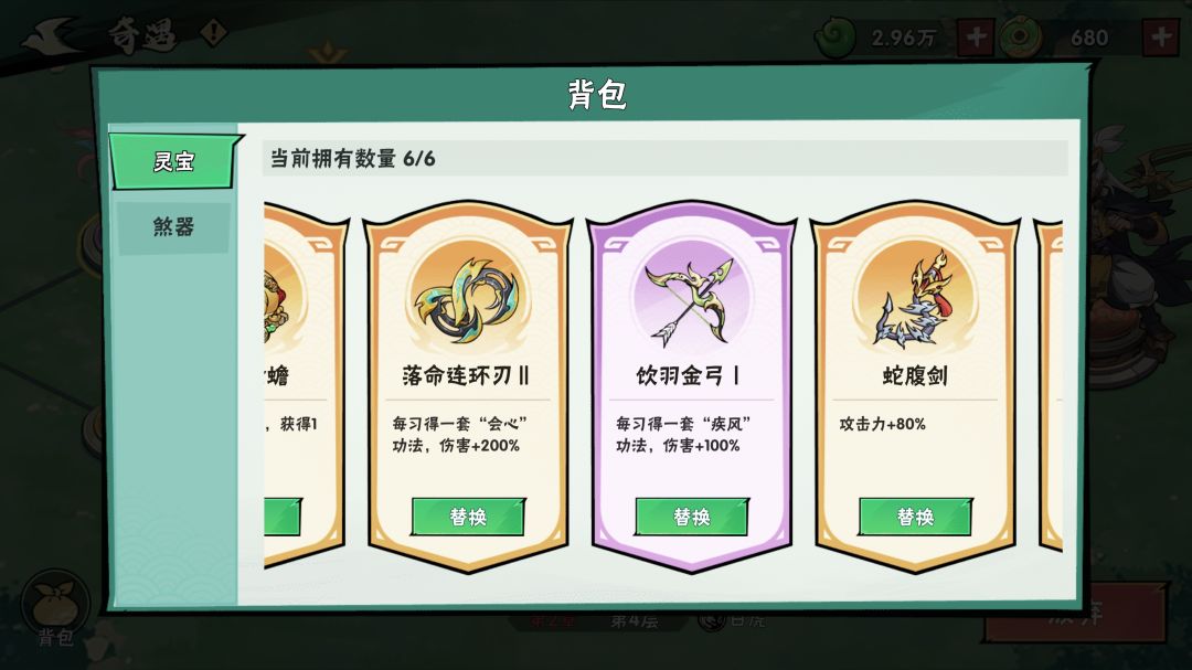 综上,我们可以做一个总结,灵岛推图与蜃影楼兰系统有些相似但又不完全相同,其核心为跳格子杀怪/对话获得云游币,商店购买灵宝增加属性,再继续跳格子,直到通关本章获得奖励(锻造锤,赛季阅历,名望等)那么如何选择局内灵宝成了重点,以我的阵容为例,霍东阁为主C,局内携带气系核心,疾风1,疾风2,会心1,会心2,圆缺,那么灵宝选择应该侧重秘籍的方向,如下图所示
