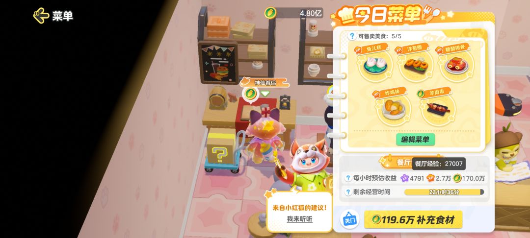 星宝们如果不太清楚自己的餐厅还有什么地方可以改进 可以去前台处点击“小红狐的建议” 就会弹出一个窗口啦