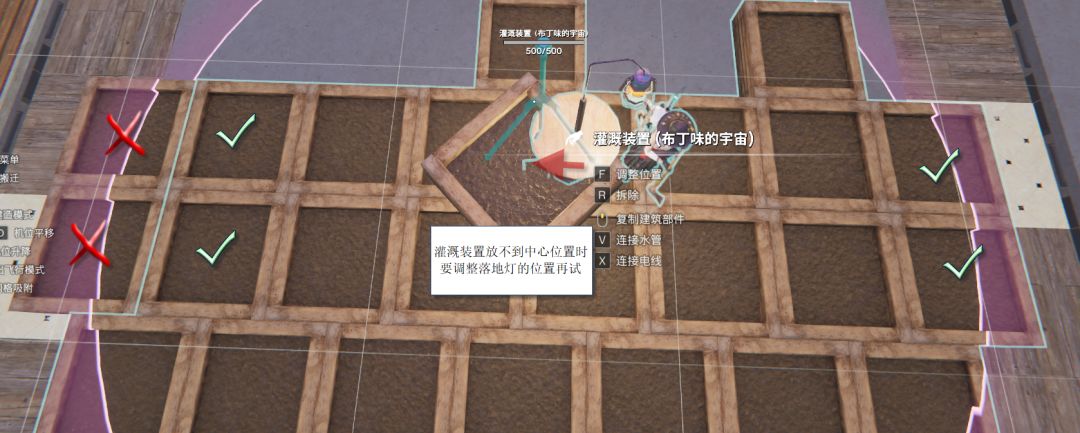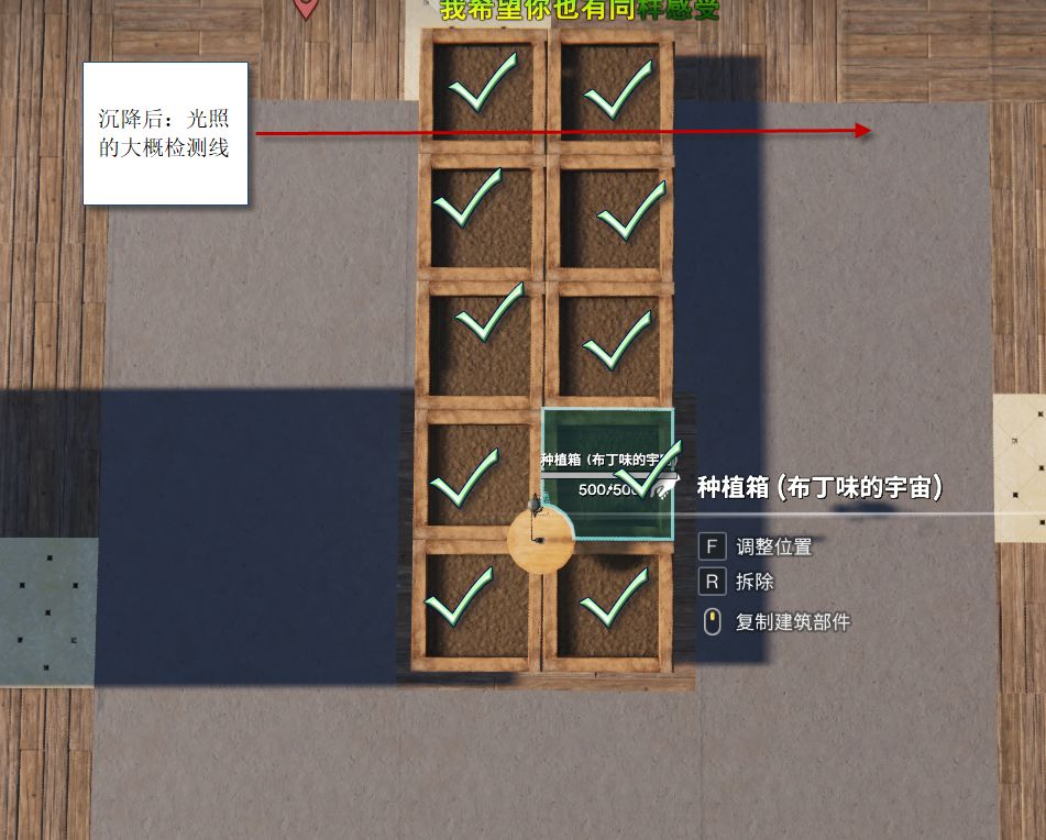 如果往外移动会导致种植箱的光照消失,所以建议选红点的位置摆放(没这么容易,要多试)