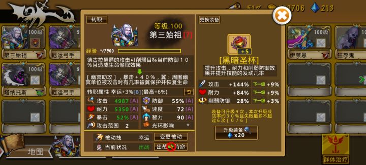 主力输出为天启骑士,100%暴击率,靠debuff打暴击伤害。暗鬼、一转银驽鬼弓、幽冥法师、鬼团上debuff,注意调整好速度,天启速度要低点。