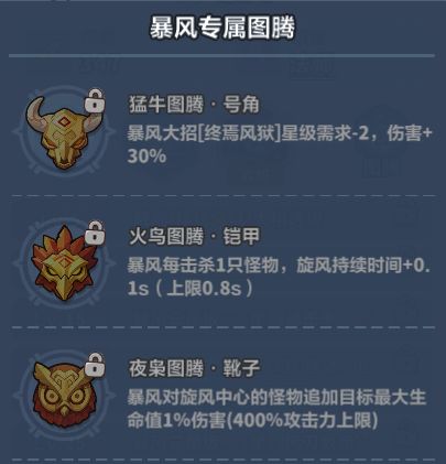 暴风的专属图腾效果分别是:「提升旋风伤害」、「增加旋风持续时间」和「大招星级需求减少、伤害增加」。