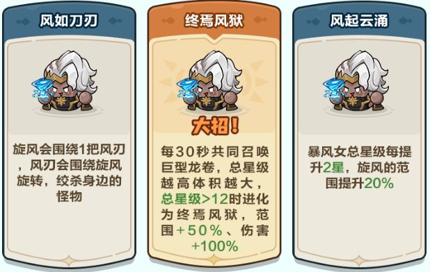【风域叠加】:场上的暴风总星级越高,召唤出的旋风伤害越高。