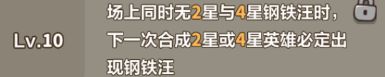 - 等级10:场上同时无2星与4星钢铁汪时,下一次合成2星或4星英雄必定出现钢铁汪。