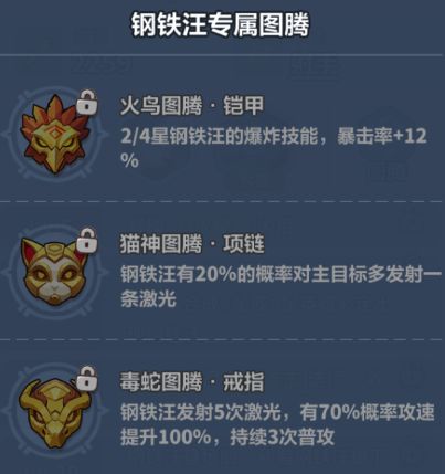 钢铁汪专属图腾效果分别是:「爆炸技能暴击率提升」、「激光数+1(概率)」和「攻速提升(概率)」