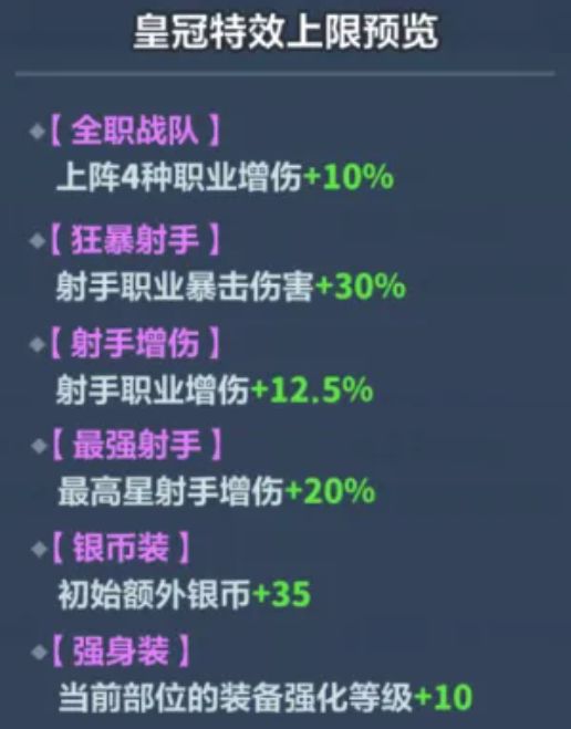 皇冠可洗炼出射手职业的专属特效,可优先选择【射手增益类】特效。其它装备特效推荐【银币装】,加快前期阵容的组成速度。