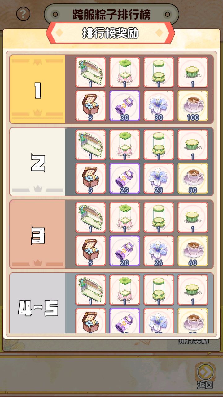 【配方】分为「粽子叶配方」+「馅料配方」各4种,活动期间内招揽特殊游客「屈原」(人气达到2000、招揽橙色游客)获得一个「粽子叶配方」或「馅料配方」礼包,每日最多可获得1个物品。。