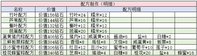 【粽子】一共有16种,使用不同的「粽子叶配方」+「馅料配方」消耗配方上指定的食材制作而成,制作不同的粽子可获得不等的积分。