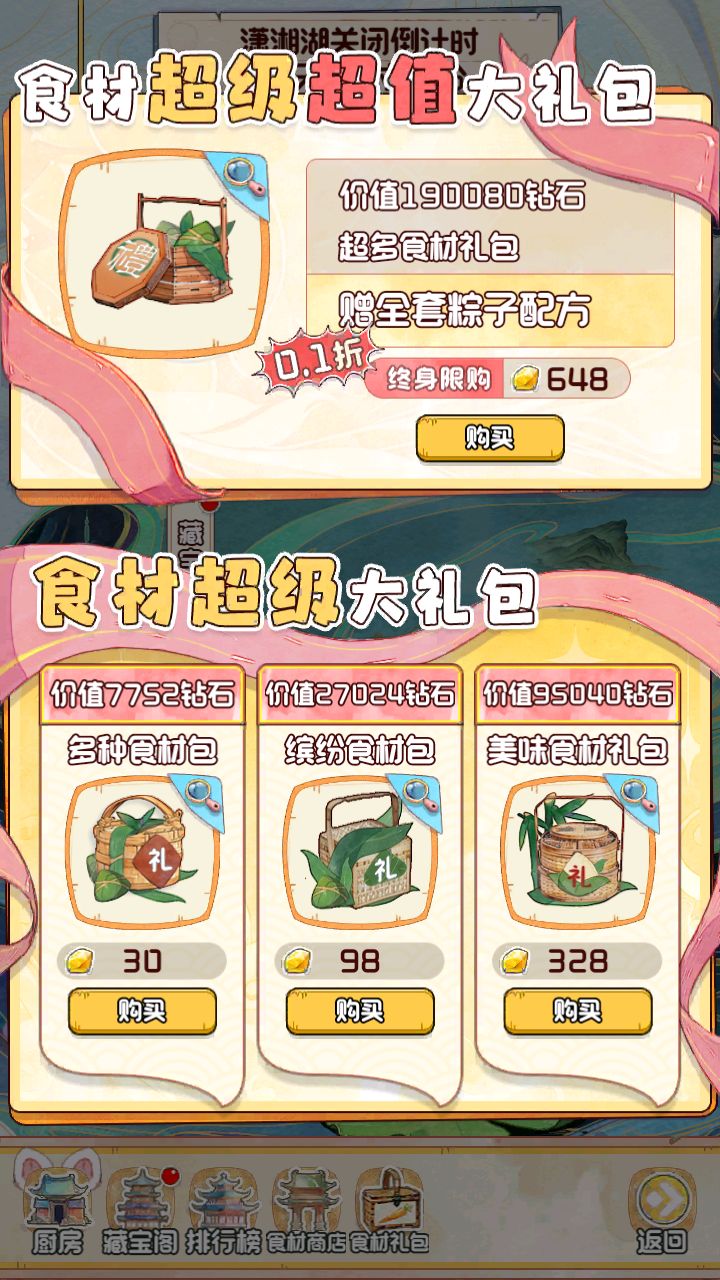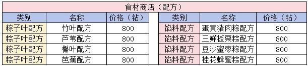 【食材】用于粽子叶&馅料制作,可以直接从厨房页面挑选食材补齐购买或者在食材商店花钻购买,此外每日特殊游客「屈原」可掉落食材礼包。