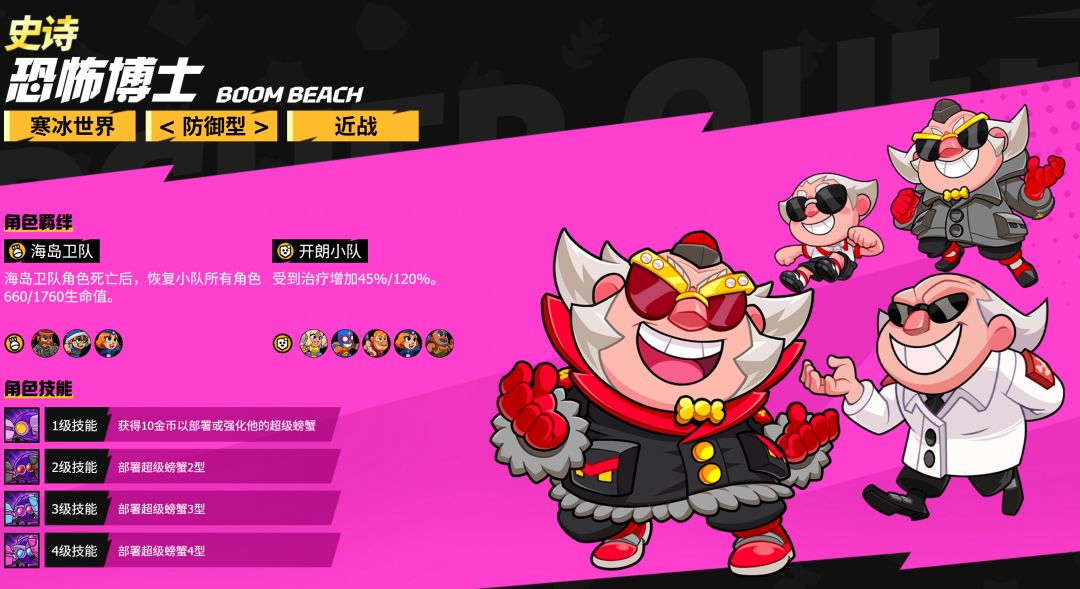 最后一位恐怖博士,也是一位防御型角色,拥有海岛卫队和开朗小队两个羁绊。