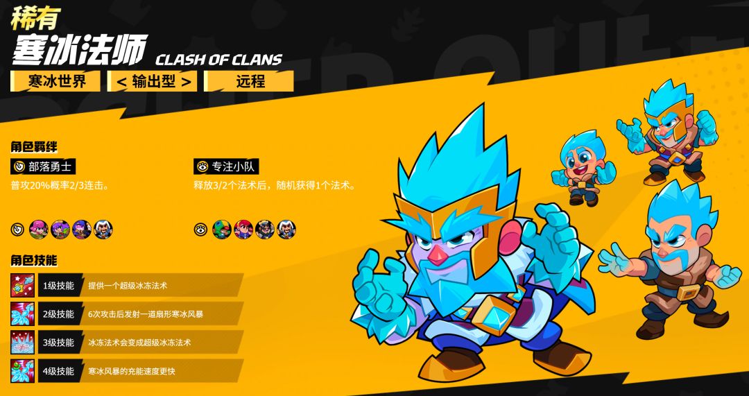 首先第一位,寒冰法师,他是一位远程输出型角色,拥有部落勇士和专注小队两个羁绊效果。