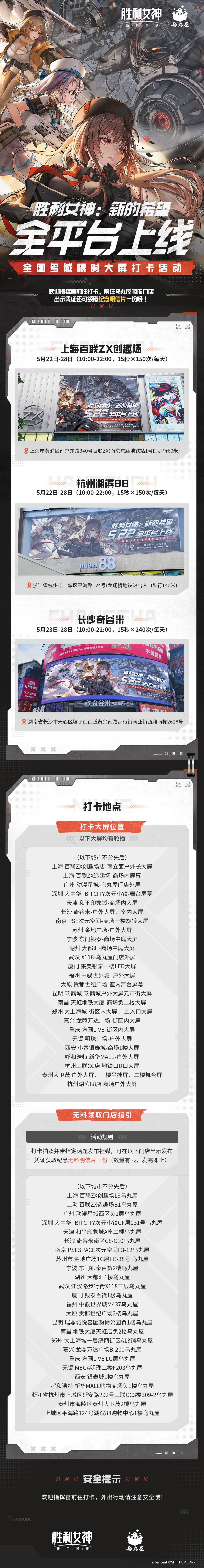 即日起~5月28日,指挥官还可前往乌丸屋指定门店,出示带话题#胜利女神新的希望全平台上线 #nikke纪念打卡 ,发布打卡照的原创帖子,领取《胜利女神:新的希望》上线纪念无料明信片一份!(*数量有限,发完即止)