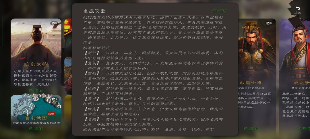 我是直到今天才知道原来还有这么一个DLC将啊,没有特性甚至连负面的都没有,传记里也没写是DLC将(加上伏完是唯二传记得里不写的),但购买界面又写了是独享新增武将的,同时在原版三国剧本里确实没有这个将(我用自建将的亲善功能查过,确实没有)