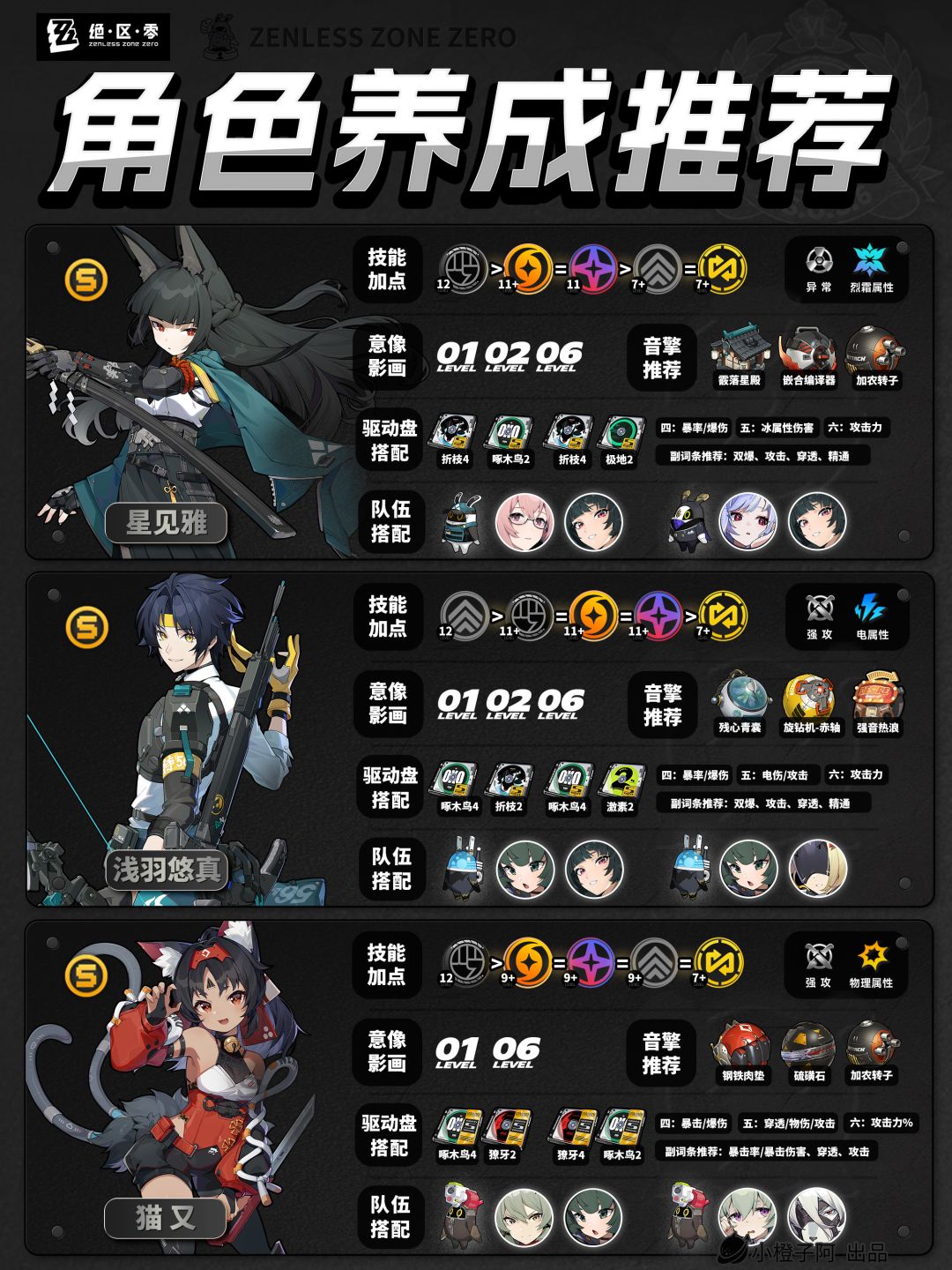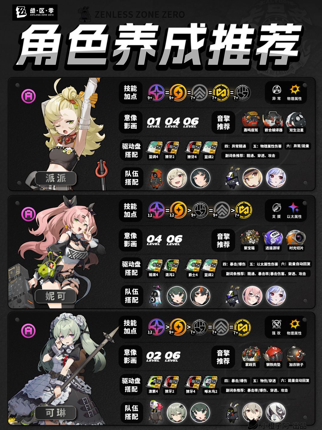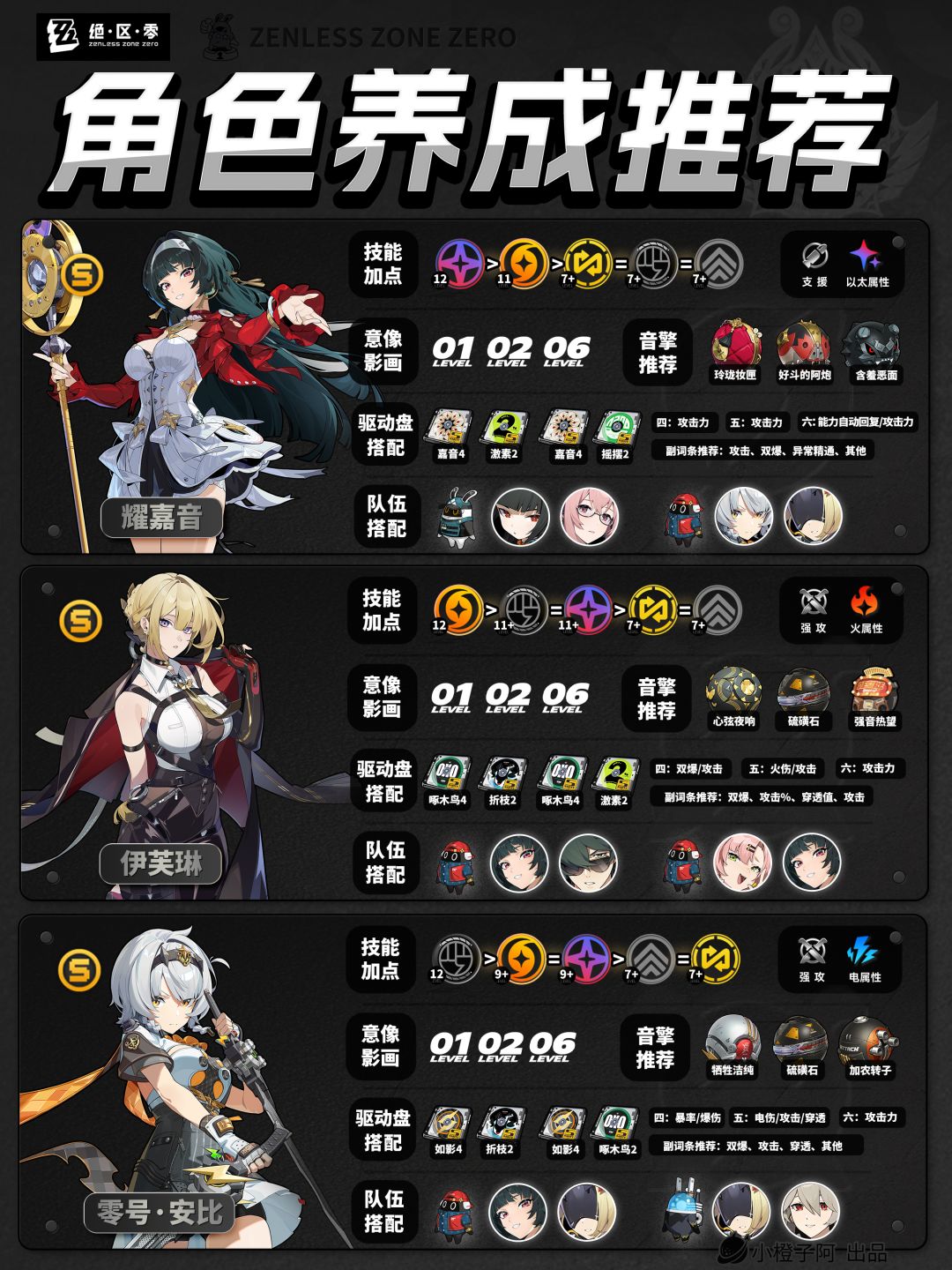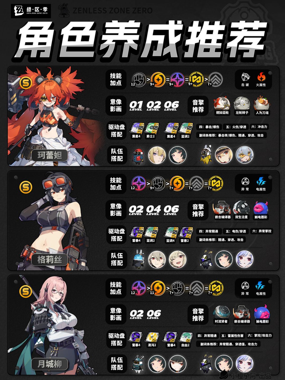 再就是一点,由于图片大小的限制,橙子每次是把角色配队更新到最新角色的组队情况,但并不代表角色只能有这两个配队,比如支援角色【丽娜】,丽娜可以加入绝区零大多数的队伍,而不仅限于下方展现的两种配队情况。