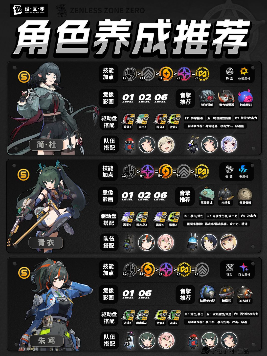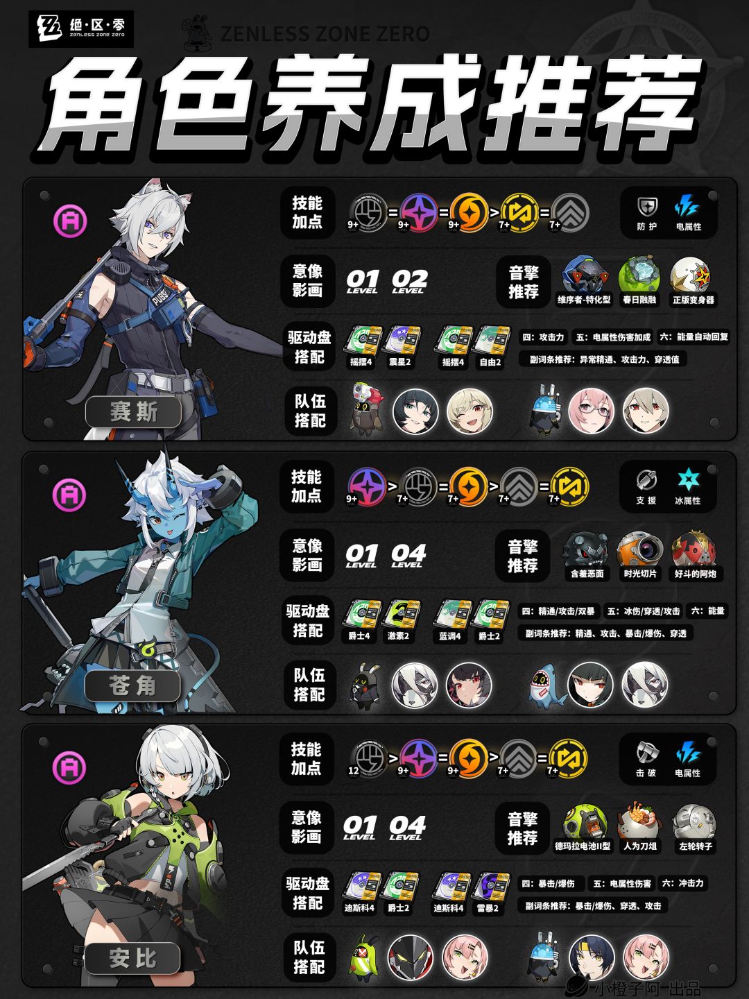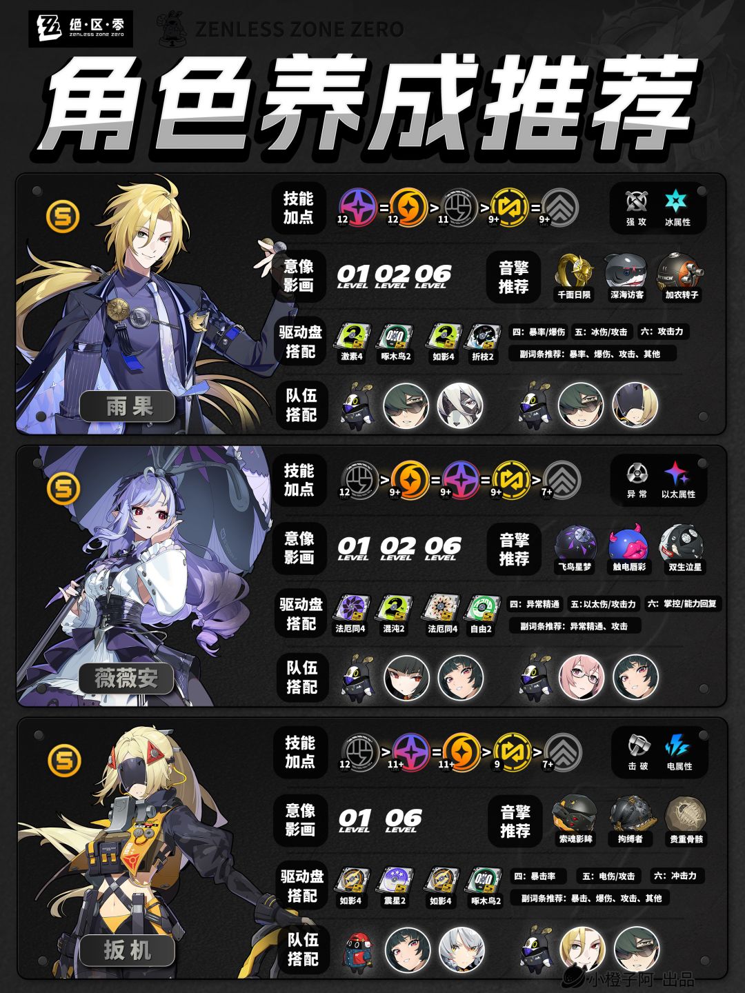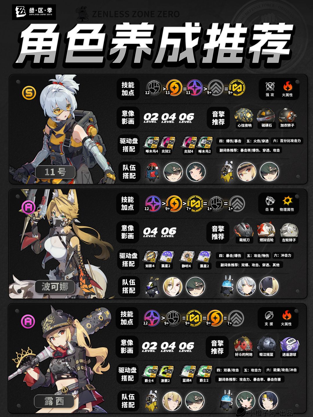 再就是一点,由于图片大小的限制,橙子每次是把角色配队更新到最新角色的组队情况,但并不代表角色只能有这两个配队,比如支援角色【丽娜】,丽娜可以加入绝区零大多数的队伍,而不仅限于下方展现的两种配队情况。