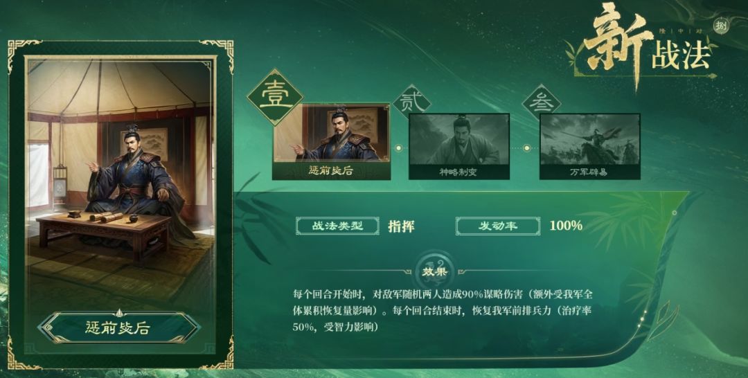 再看看新战法。惩前毖后是指挥战法,回合开始时会对随机两人造成90%的谋略伤害,而且这伤害受全体治疗量影响,回合结束还能恢复前排兵力,治疗率50%也受智力影响,推荐和神诸葛的一字阵搭配,比如刘备+神诸葛+姜维。