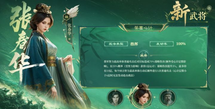 接着是张春华,她的战法机制就像是“运智铺谋MAX版+慢速马腾结合体”。基础有70%的额外谋略追伤,心计基础概率20%,实战可能达到30%,叠满还能有30%的增伤,这和四回合蓄势待发的效果差不多呢,感觉她可能会和司马懿搭配。