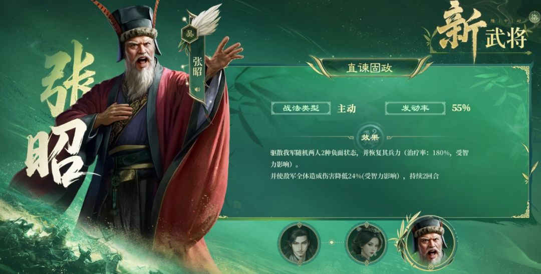 最后是张昭,他的主动战法发动率是55%,和清风驱疾一样。效果是能驱散负面、回血,还能让敌军全体伤害降低24%,受智力影响,实战可能达到30%-40%。他就像是挫锐折锋+清风驱疾的超级Promax版,是开荒的强将。