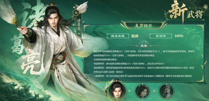 先说说新武将。首先是新诸葛亮,他自带的战法「星罗棋布」可厉害啦!全体能获得10%的谋略减伤,而且这减伤效果还受智力影响,实战中能达到15%-25%呢。阵型加成效果更是能提升70%,同样受智力影响。具体来看,箕形阵后排增伤从12%提升到20%,锥形阵前排增伤从16%提升到27%,雁形阵后排增伤从15%提升到25%,方圆阵后排连击率从40%提升到68%,偃月阵前排增伤从14%提升到24%。在阵容适配方面,如果是单前排,比如鱼鳞阵赵云,叠加规避率能达到50%-60%,让后排有很大的生存优势;双前排,像偃月阵、雁形阵、方圆阵,能提供20%的固定增伤和200%的伤害补足;三前排的一字阵,就可以配合治疗型武将,比如皇甫嵩、刘备荀彧。