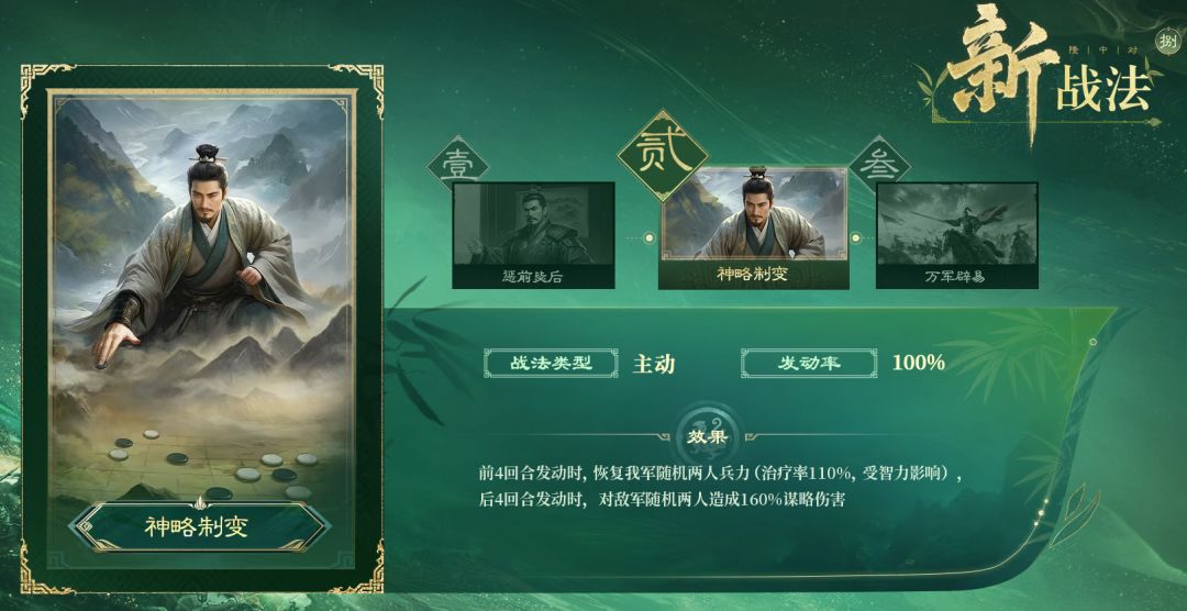 神略制变是主动战法,前4回合能恢复随机两人的兵力,后4回合会对随机两人造成160%的谋略伤害。不过它虽然发动率是100%,但节奏偏慢,整体强度一般。