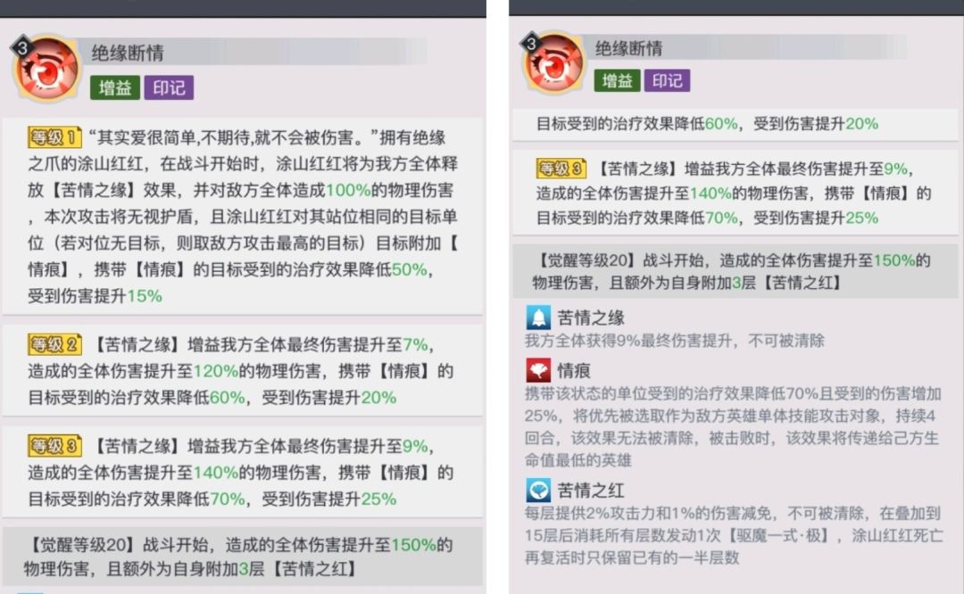 【绝缘断情】技能满级状态下,在战斗开始时,涂山红红将为我方全体释放【苦情之缘】效果,并对敌方全体造成140%的物理伤害,本次攻击将无视护盾,且涂山红红对其站位相同的目标单位(若对位无目标,则取敌方攻击最高的目标)目标附加【情痕】,携带【情痕】的目标受到的治疗效果降低70%,受到伤害提升25%。