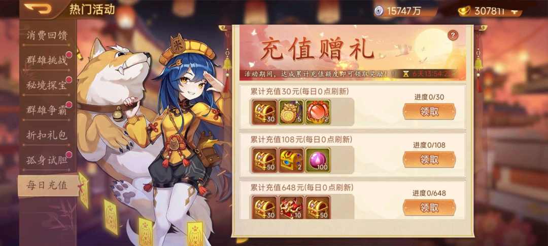 活动内容:活动期间,单日充值达到目标值即可领取奖励!