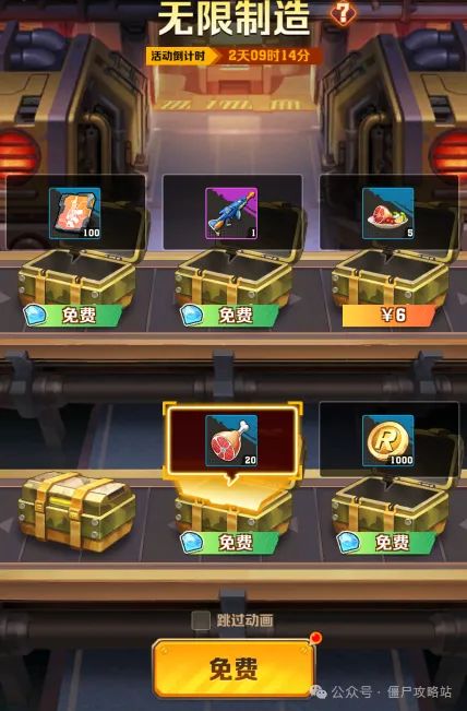 玩法很简单就是两排内容会陆续轮换,显示免费标签的可以直接白嫖,而显示6r这种的则需要氪金获得,如下图我们体力*20和金币*1000是可以免费拿到,但是轮到体力包的时候就需要氪6r,才能接着往后拿紫色的枪皮。