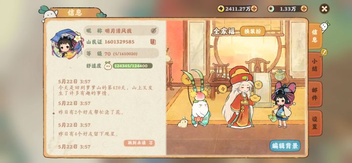 3、自定义信息面板。桃源不出排行榜的思路是对的,这游戏的定位本就是休闲,而不是氪金的攀比。但舒适度都无法向其他玩家展示属实有点过于离谱,游戏后期舒适度除了是一串数字真无一点作用。其实完全可以让玩家自行选择隐藏或展示舒适度,让玩家有选择的空间,也能提升氪佬玩家的氪金欲望。还有玩家面板的背景能不能切换白天黑夜?有些背景的黑夜场景巨好看但放到个人面板上只能默认白天!