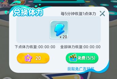 在原有的体力系统基础上,额外增加了广告回复功能,点开广告并在播放完以后,就可以免费领取20体力,每天共有5次机会