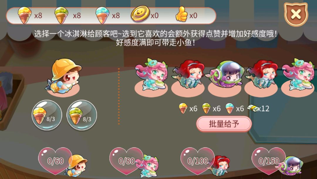 订单环节,需要将冰淇淋送出给鱼儿,收获它们回馈的赞和金币~