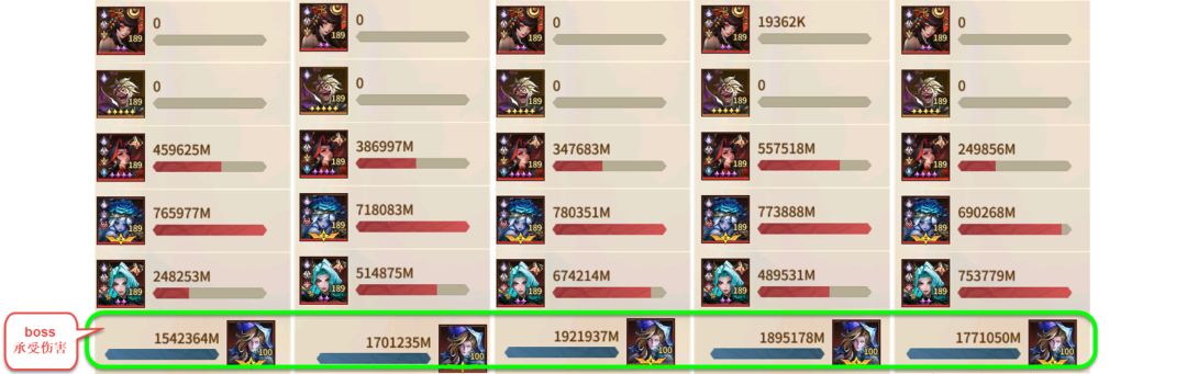那么,女帝这50%的伤害加深对什么有效呢,通过上面伤害的测试,我想大家都猜到,是卡的主动伤害增加,我们来两组数据验证下,数据上就直接从boss 的承受伤害上来进行对比,更直观。
