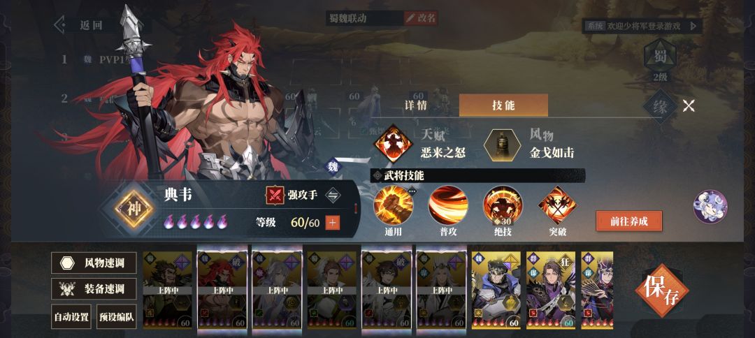 张飞:逆境c,前期负责挨打和回能工具人,由于技能原因通常血量是全队最低的,也就是说是被挂反击buff的常驻人选。张飞天赋和战狂职业配合风物不动如山只要挨打就能提高攻击,在有反击buff的情况下哪怕前期只是当回能工具人也能有不俗的输出能力(尤其是配合典韦一起精准反击对面输出)。到了后期攻击叠起来后会反超一众输出成为最高,也就是说会被优先被对手集火变相保住了其他输出。那时候张飞功攻高防高不带怕的,有能量的话一个大招巨疼还能把血吸满。