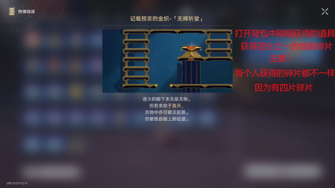 找齐「无晖祈堂」黎明云崖所有若虫后,在衣匠处获取提示以及任务道具:四分之一片地图碎片。