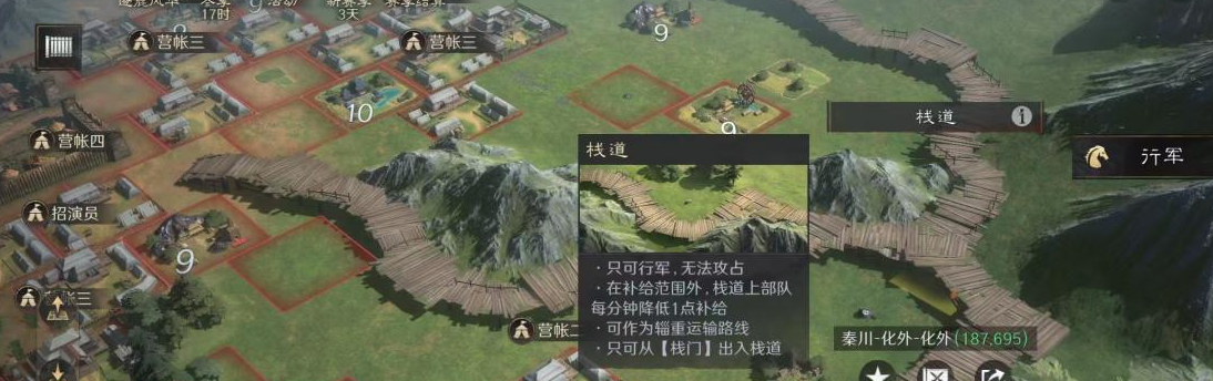 只可行军,无法攻占。在补给范围外,栈道上部队每分钟降低1点补给。可作为辎重运输路线。用于出入栈道。