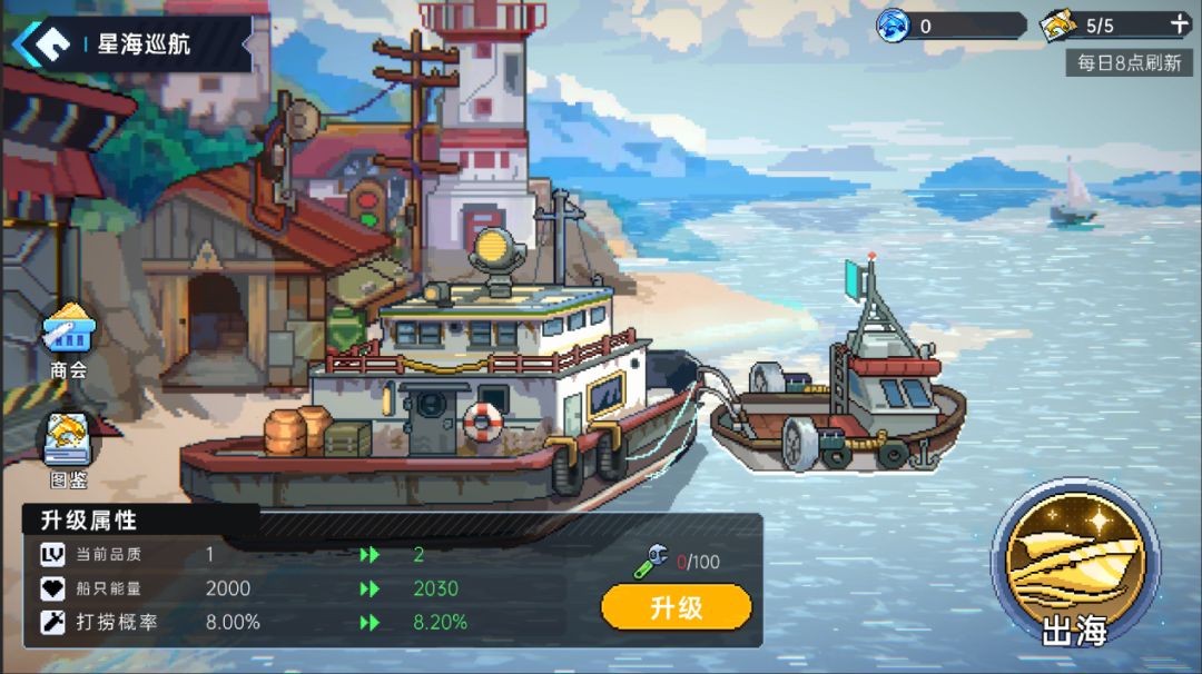 在海中捕获鱼类,【返航】时获取【捕捞币】用于商会中兑换奖励。