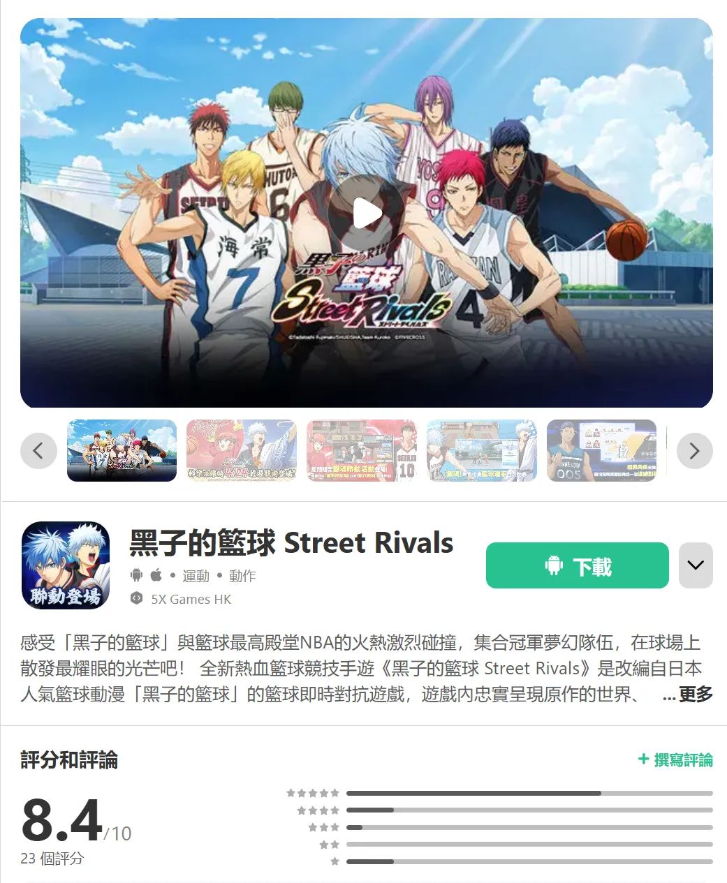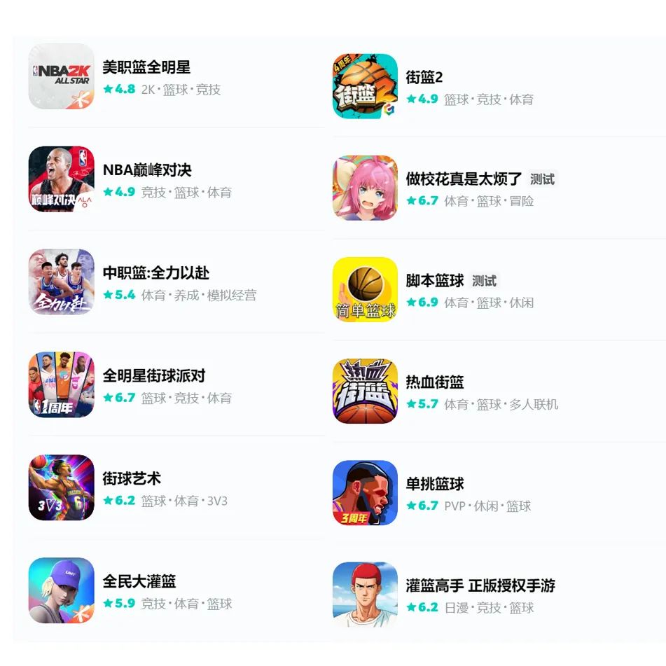 咳咳,言归正传,而黑篮其实大家不要看这国服还没正式公测,它在海外则已经公测了一年有余的时间了,而至于海外玩家的评价嘛,大家倒是可以从海外版taptap的8.4高分来衡量一番,毕竟针对这个篮球竞技手游,想要在taptap中拿到7分以上的分数都是极为艰难的,而且颇多篮球手游的评分也只能在4-6分上下徘徊(可参考下图)......这也足见黑篮这款游戏的玩家口碑还是挺不错的。
