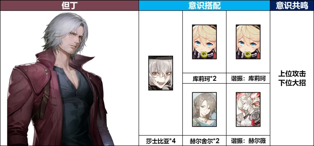 意识方面,但丁没有专属意识,在缺少死线计时的情况下使用单大流程,携带4莎士比亚2赫尔舍尔谐振赫尔薇;若有专武与死线计时则可以选择使用双大流程,携带4莎士比亚2库莉珂谐振库莉珂;意识共鸣均为6攻击6大招。