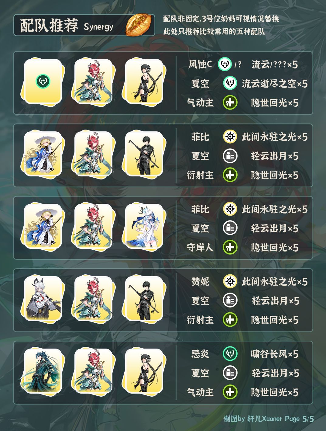⑥ 夏空需要等待一位未来风蚀大C,风蚀队即可成型。当前版本可以辅助菲比/赞妮,利用大招上光噪效应也可行。再其次如果能有二命夏空,气动加成,也可以考虑忌炎。