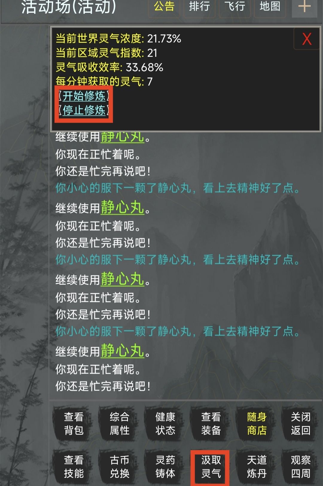 同样,修炼灵气的按键在 锻体右边“汲取灵气”就是了,汲取到足够的灵气后点开灵药铸体,阴阳平衡点击祛除浊气即可