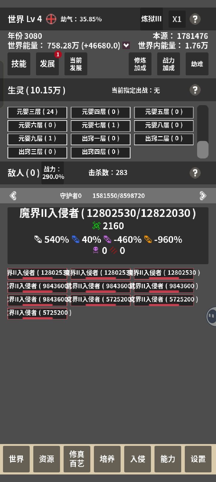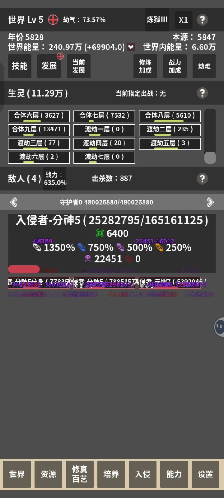 有好多bug,前期还好,后期好难守,后期有时候每秒上千万,给我看懵了,还好直接把他秒杀,然后本源直接获得100多万。