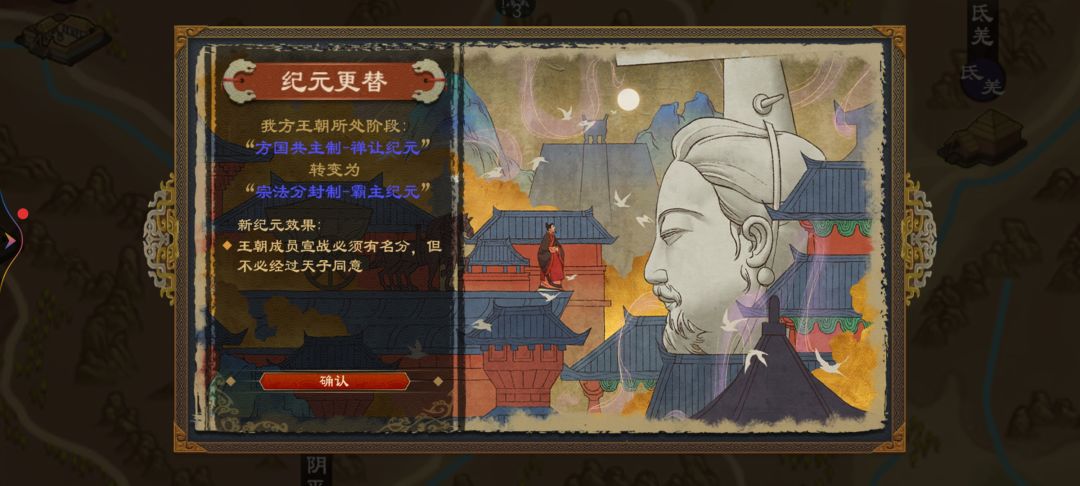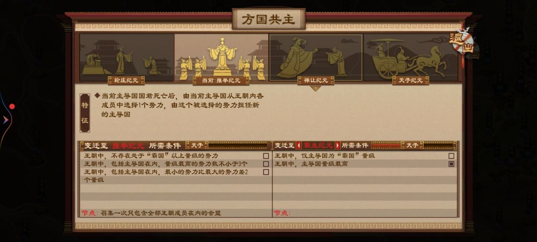 禅让纪元变迀到霸主纪元的条件是:王朝中仅主导国一个霸国量级成员,王朝中主导国量级最高(这个简单从推举纪元变迀到禅让纪元后把自己搞到36城即可)