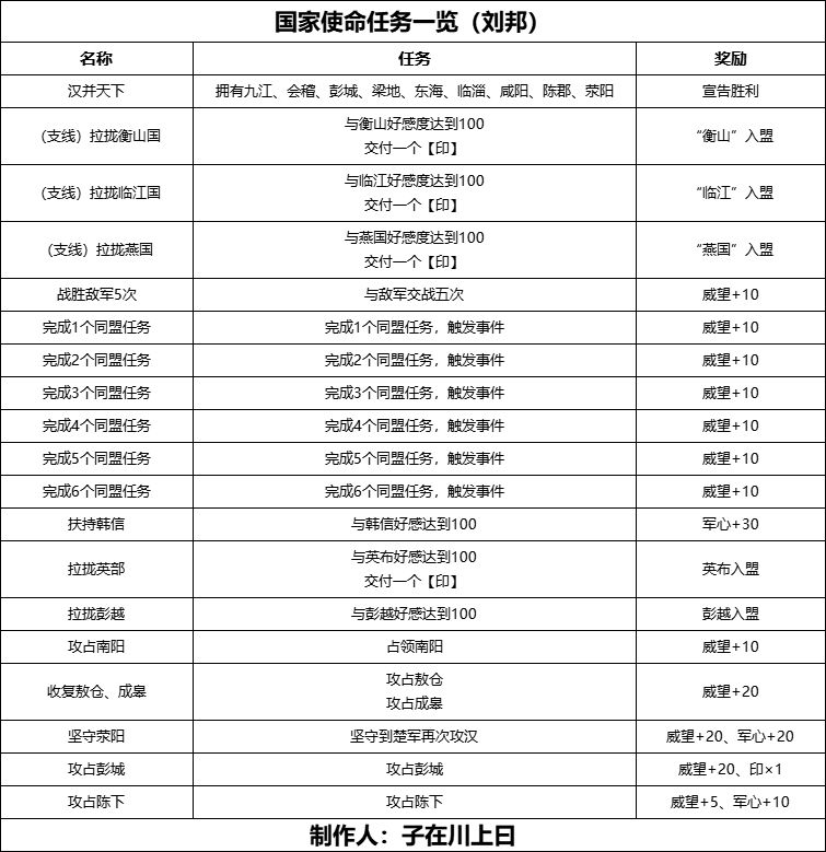 刘邦具体国家使命任务可见下表: