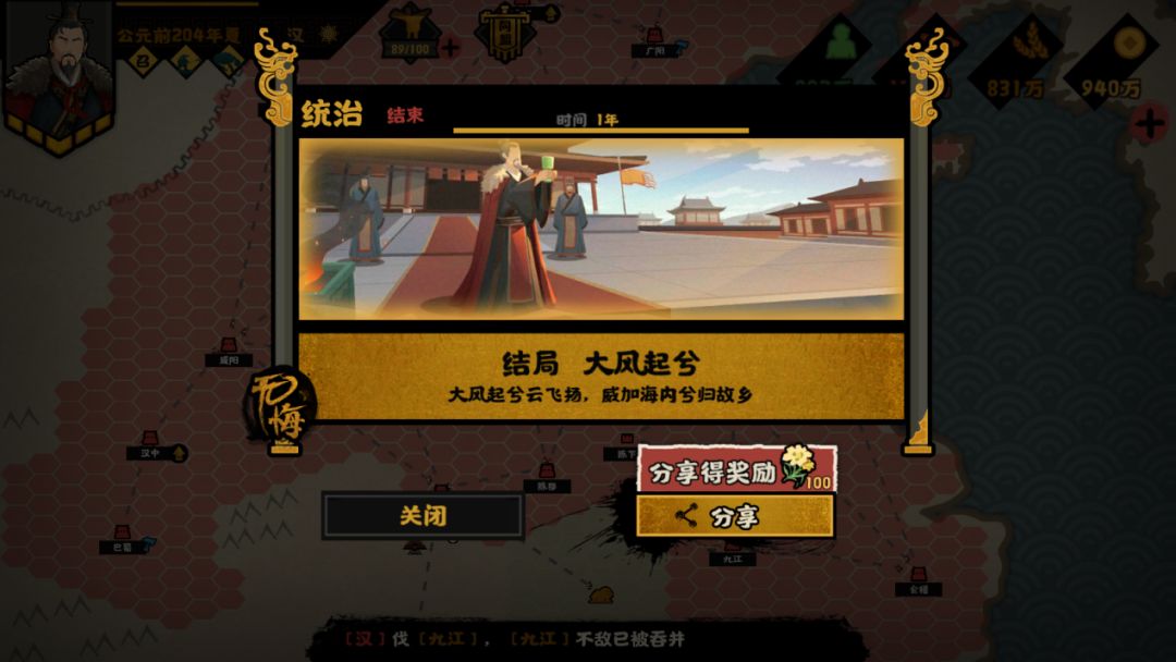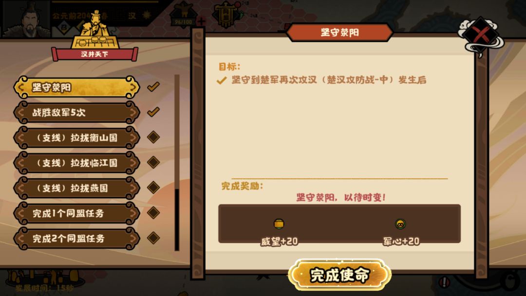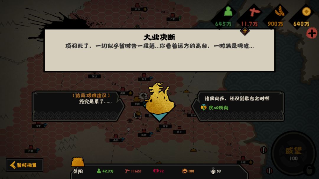 后续,通过【伪游云梦】、【彭越之难】、【英布反叛】剧情事件与剧情战斗,分别运筹帷幄吞并灭掉韩信、彭越、英布,即可达成终局国家使命任务【汉并天下】