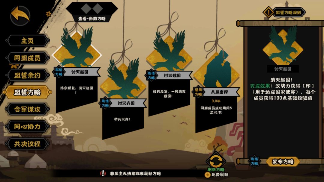 与此同时,我们也可以在同盟盟誓方略界面,接取【讨灭魏国】、【讨灭赵国】、【讨灭齐国】的方略任务。