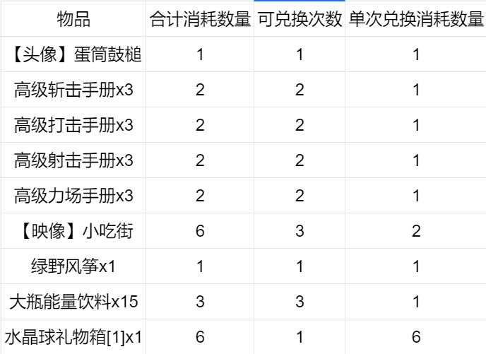 这次六一活动和上一个圣诞活动一样,每天五兼职拿五十个小代币去换大代币,一天正常兑换换六个,推测一下估计每期除大活动以外都是这么个规则,全部物品消耗如下图:#开放空间游戏攻略