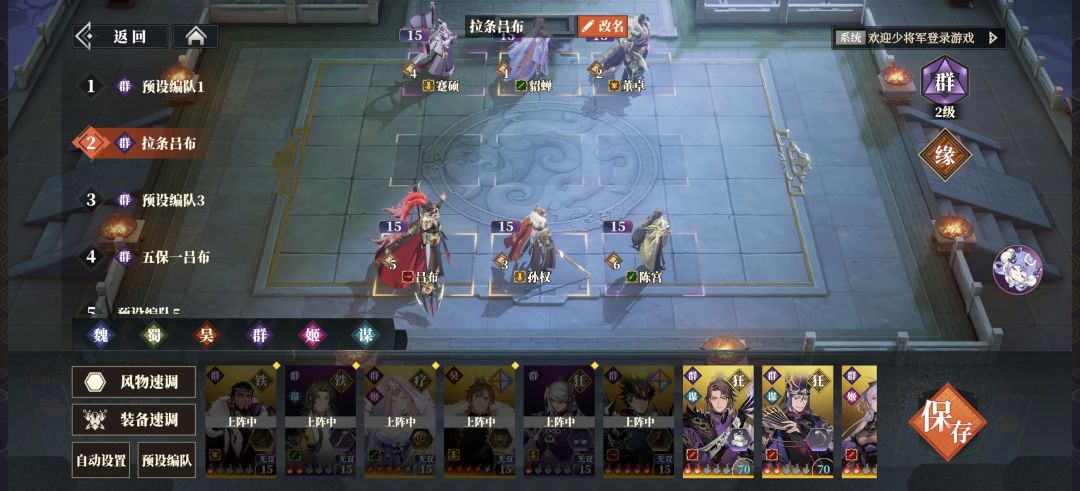 零氪第13天,阵容再次升级,变成双拉条双核心吕布,60万战零氪也能越战110万战大佬,阵容强度再次拔高一个档次,具体阵容为:吸血董卓带琴,吕布,貂蝉,陈宫,太监,孙权。