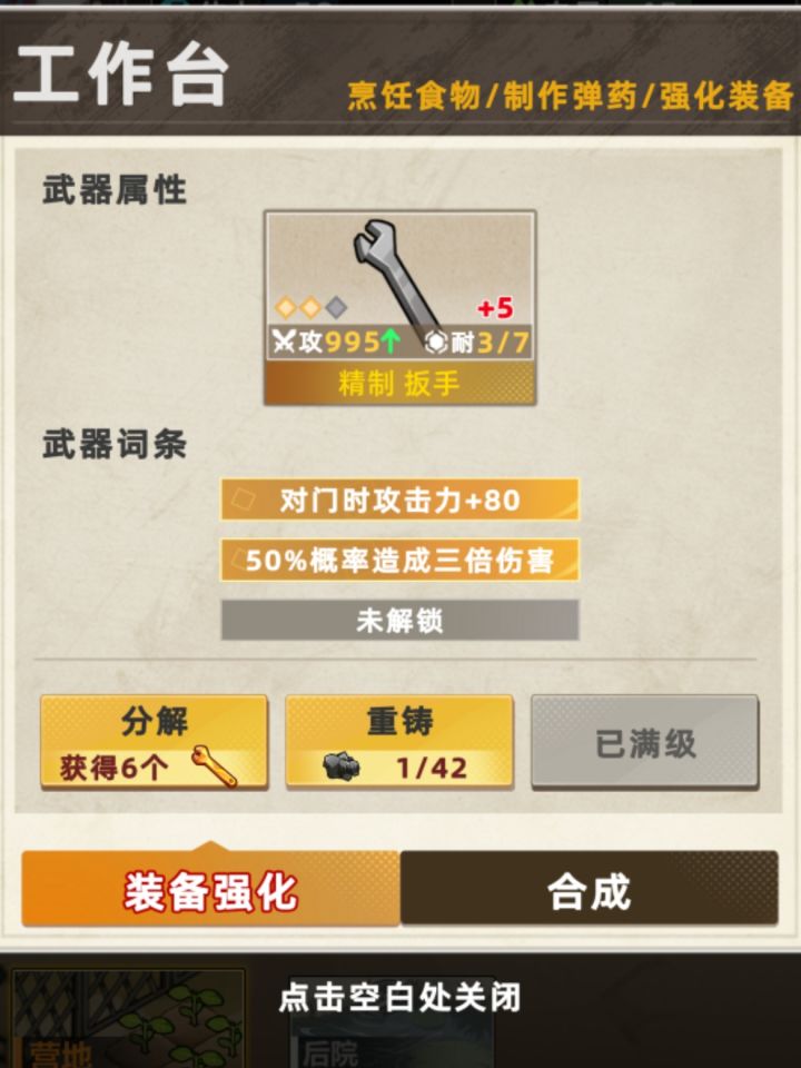 第一期中以永久赠送的沙漠只因为例强化+5,毫无疑问是非常适合清杂的,正是因为越往后期越具有不确定性,所以尸潮和尸潮的物资都让人难受又无法拒绝,甚至出现尸潮大量高速浴火怪的情况,好不容易熬完尸潮去地图一个金门直接撬锁失败瞎折腾,所以本期的主角,毫无疑问是近战之首,扳手!这个赠送的扳手其中50%三倍伤害毫无疑问是赌狗的最爱,不论是在前期破门,还是一直以来在玩家和大盾的博弈中都是最受欢迎近战武器,图中为正常活力与热血buff下的满级扳手,即便尸潮被一群浴火怪顶到了最后出现一个2000+的蛤蟆在你脸上,你也并非没有一战之力,压上自己的生命,放手一搏吧![[表情_开心]](https://img-tc.tapimg.com/market/images/48516f625646b5ea2c66f0cab3c9c52a.png)